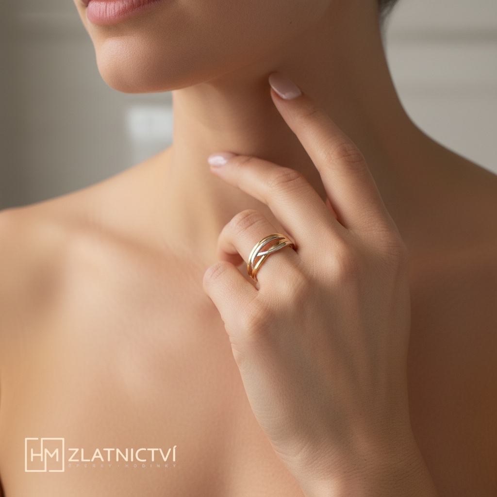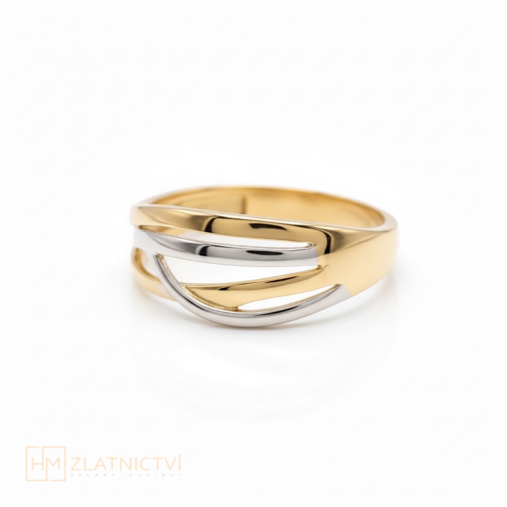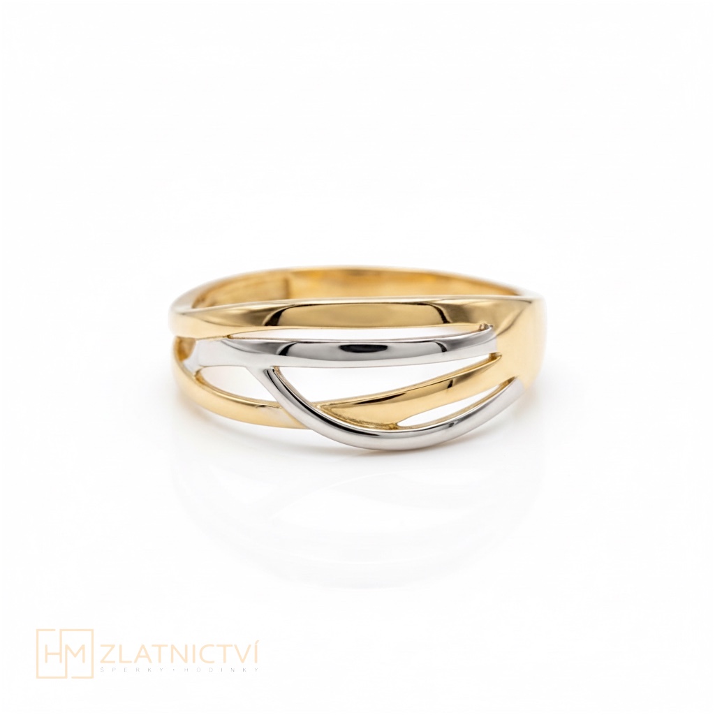 Elegantní celozlatý prsten vyniká svou lehkostí a jemným, vzdušným designem. Dominantním prvkem jsou něžně proplétané linie, které jsou decentně zvýrazněny bílým zlatem, díky čemuž šperk získává zajímavý kontrast a sofistikovaný vzhled.